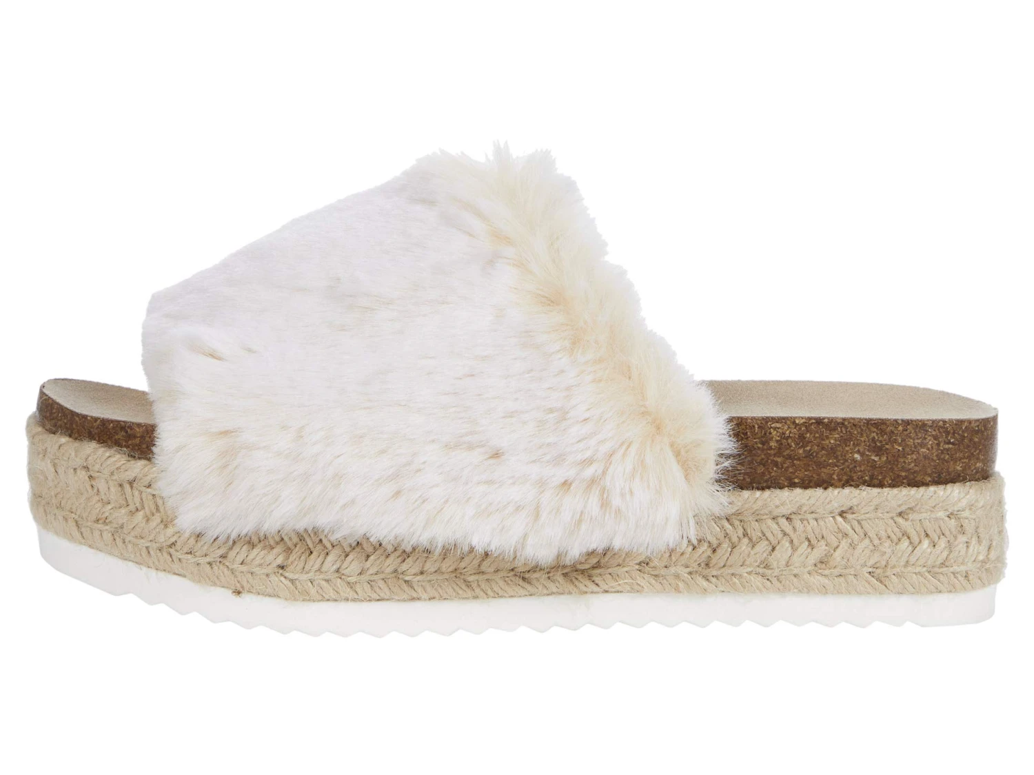 - Synthetic upper with wide, faux-fur strap across the vamp.