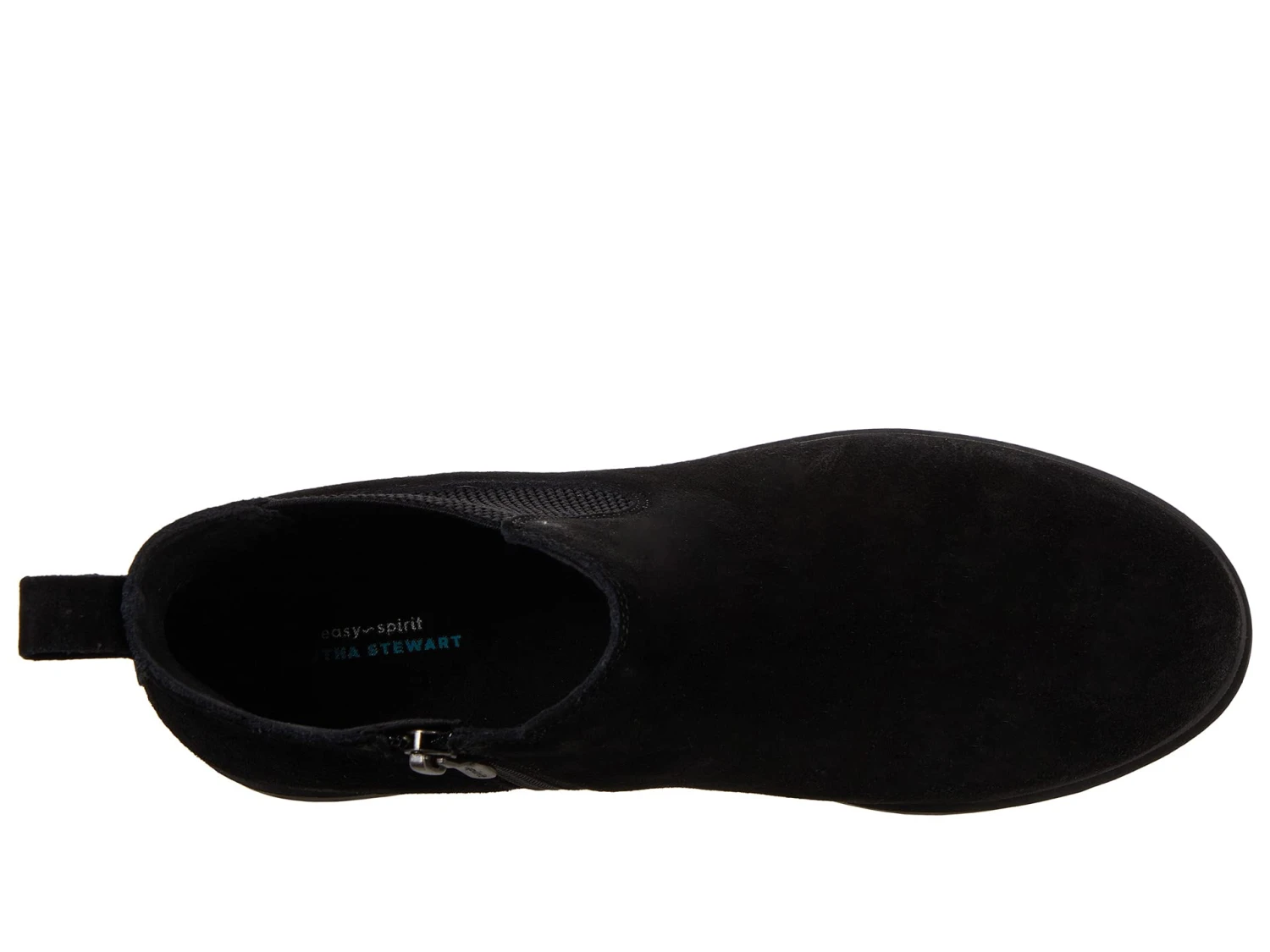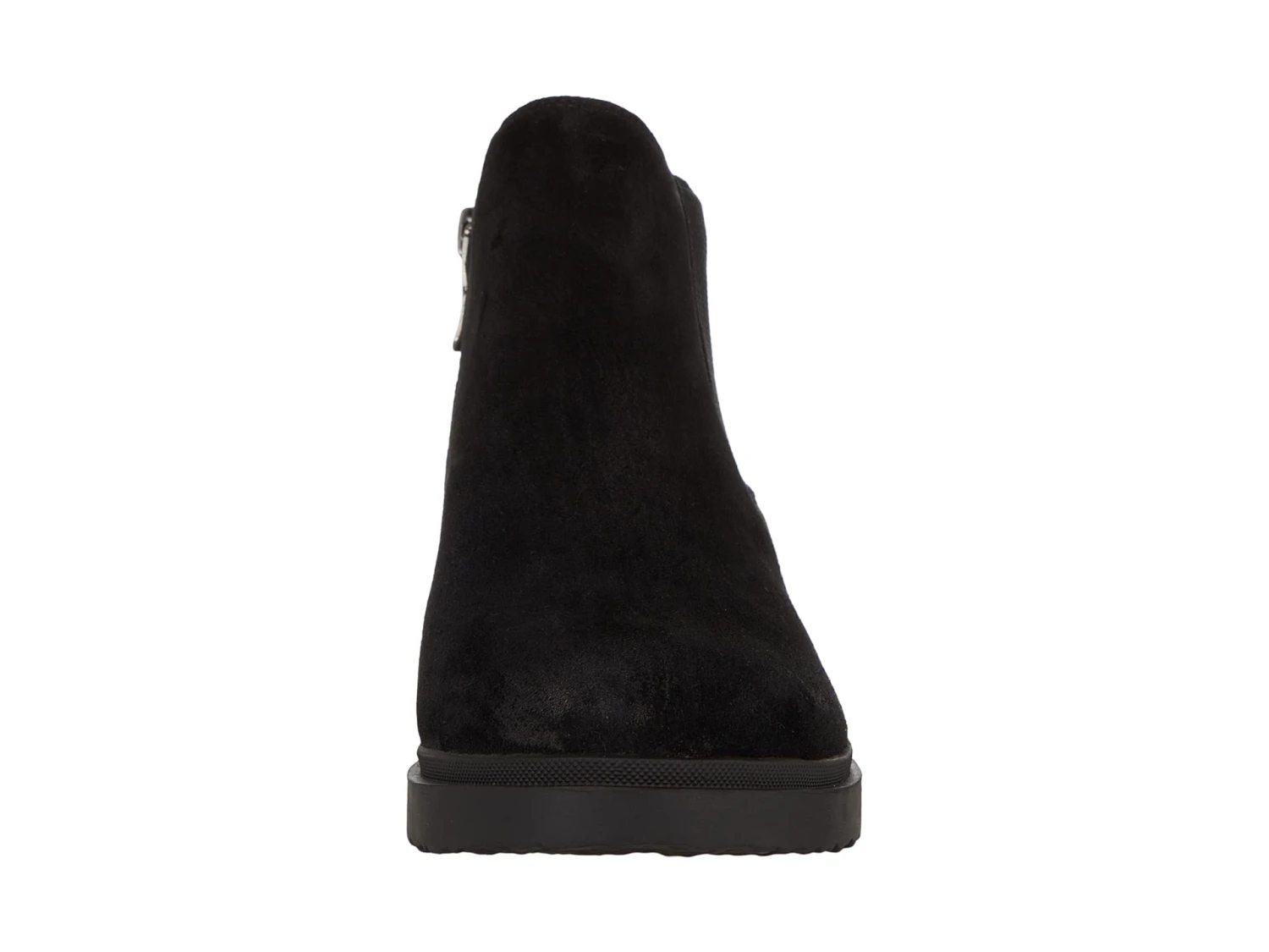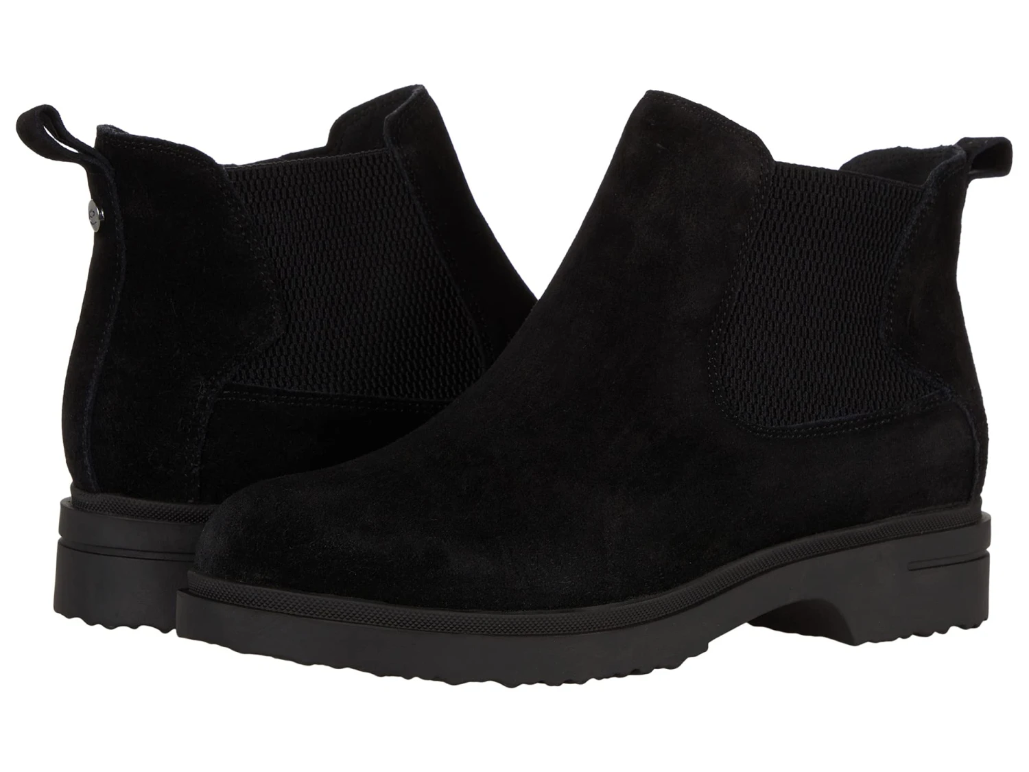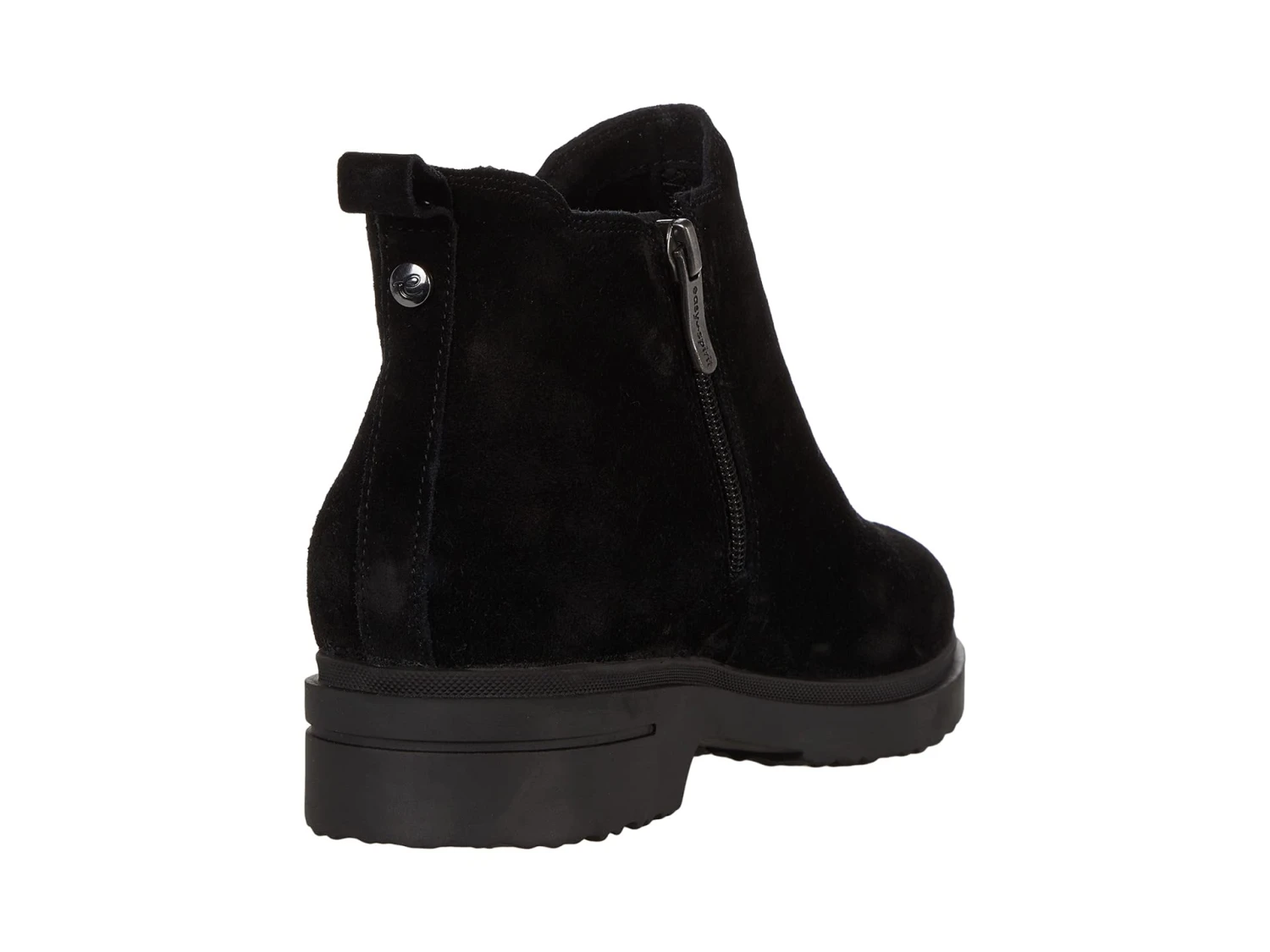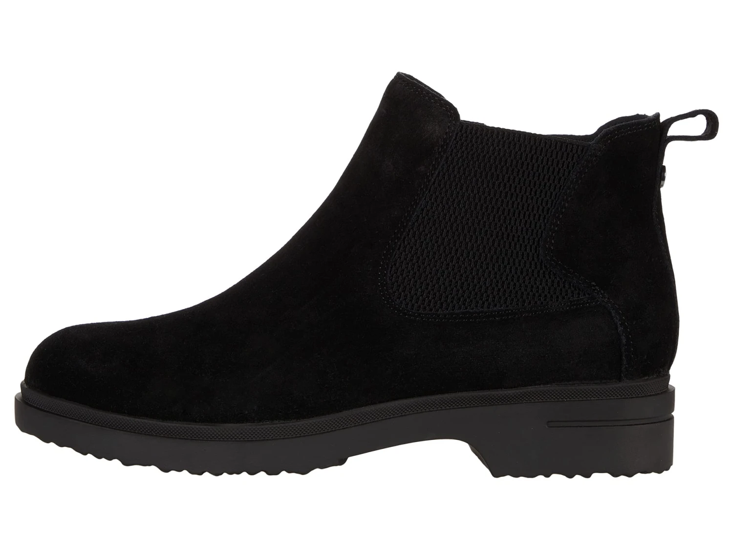 - Ankle-height boot features closed rounded toe, elastic gore side panel, and low heel.