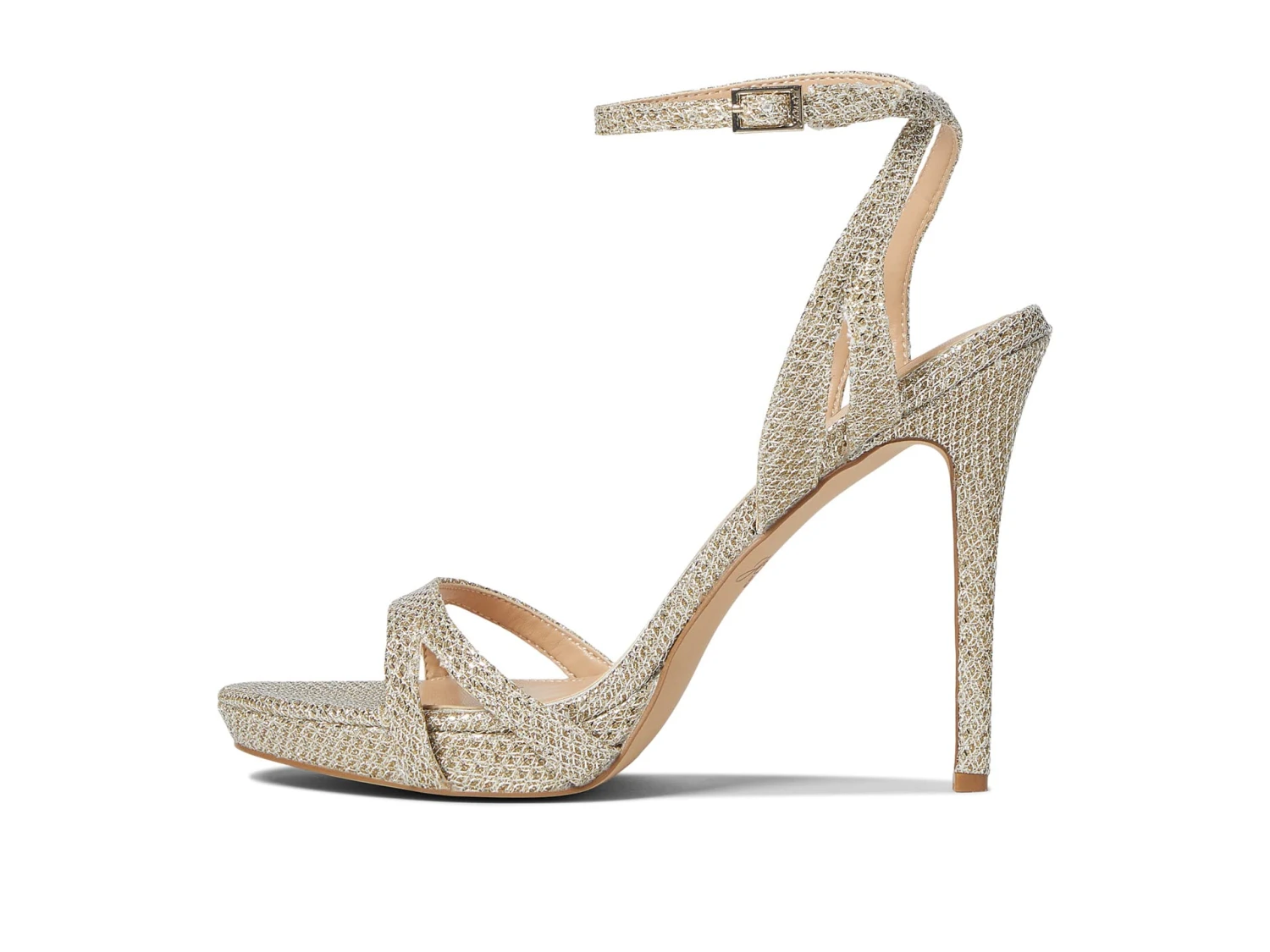 - Strappy adjustable ankle strap with buckle closure.