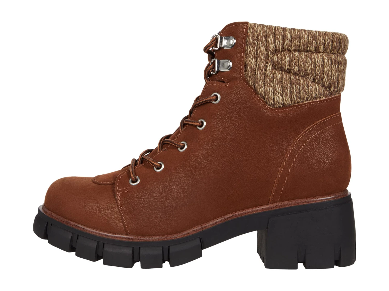 - The MIA Catalin-SW has a comfy knit cuff that adds to the cold-weather appeal of a rugged lace-up hiker boot grounded by a block heel and lugged sole.
